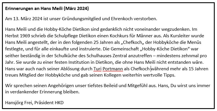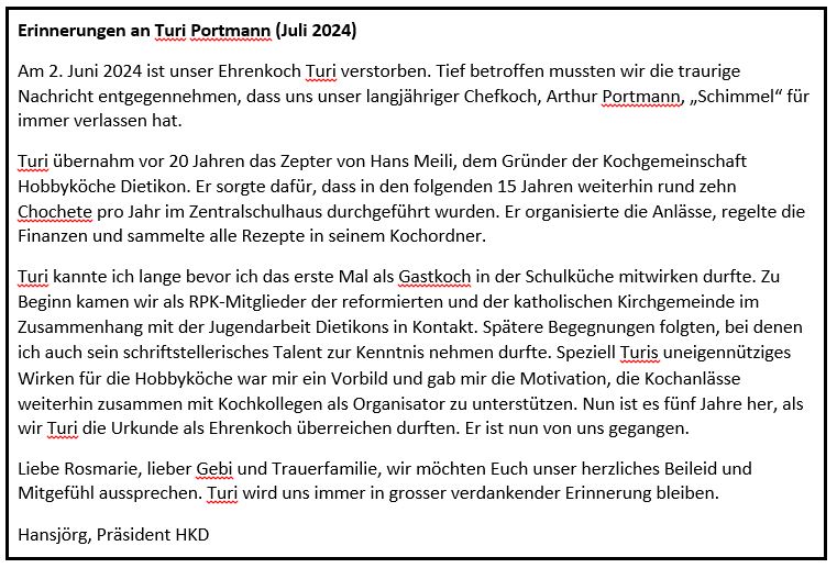 Es sollte im Frühjahr 2019 nicht die letzte Chochete sein. Im März 2019 beschlossen die Hobbyköche deshalb, den langjährigen Kochbetrieb wie bisher weiter zu führen. Als Verein - der auch durch die Personalunion mit drei Mitglieder des Seniorenrats Dietikon das Zusammenwirken mit dem Seniorenrat (Kochkurse mit Markus) zu organisieren beabsichtigte (alle "Hobbyköche" waren ja nunmehr im Seniorenalter). Das Zusammenwirken mit dem Seniorenrat Dietikon - seit 2024 TERZO Dietikon hat sich bestens bewährt. Senioren, die in den Kochkursen des TERZO Gefallen an der Schulküche finden, können bei unseren Kochabenden weiter als Gastköche am Kochherd schnuppern. Ihr Interesse melden sie zuvor bitte beim Leiter der TERZO-Kochkurse, Markus Schneider, an, der gerne über die Kochabende berichten kann.